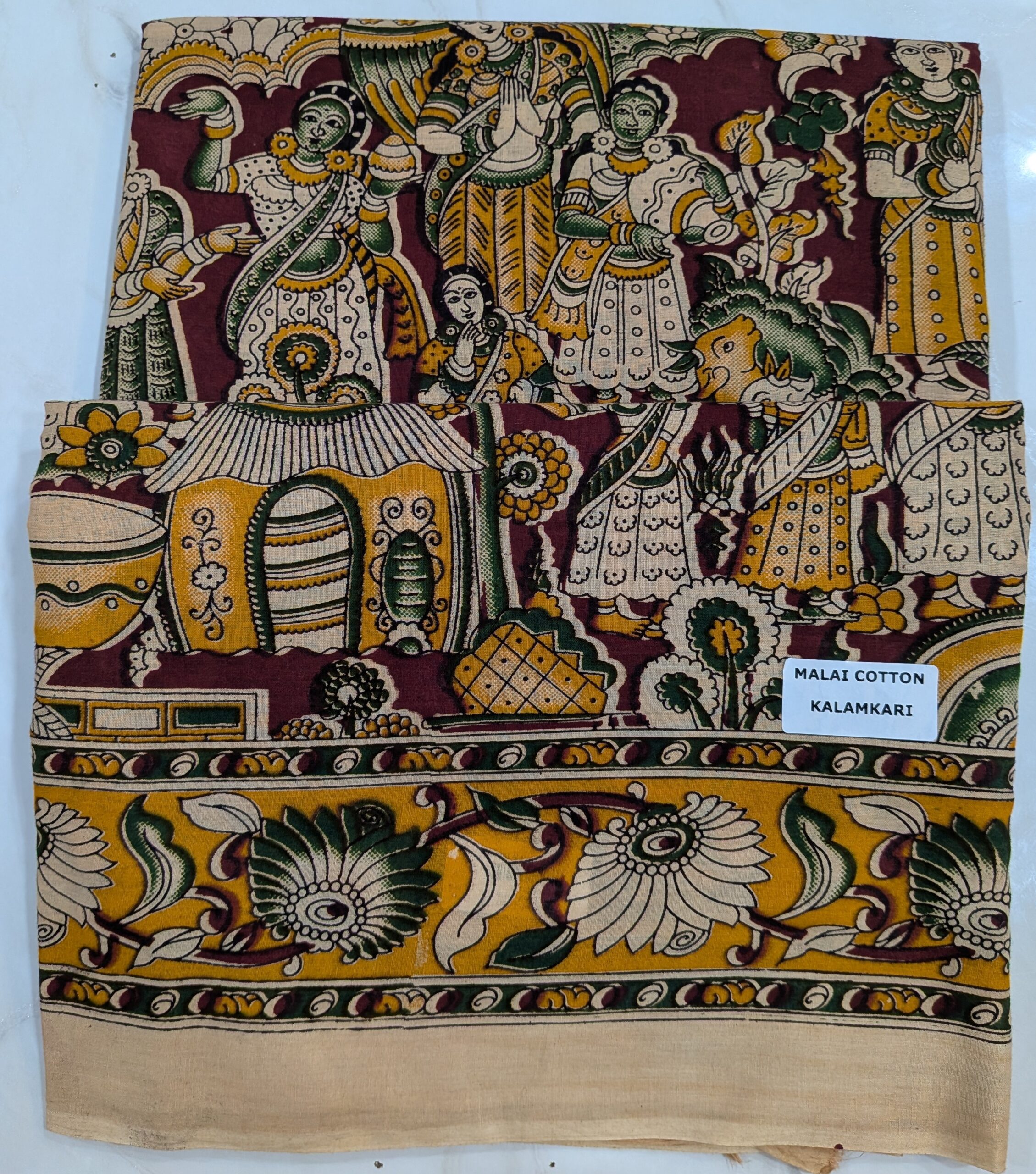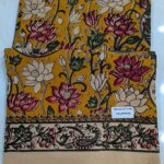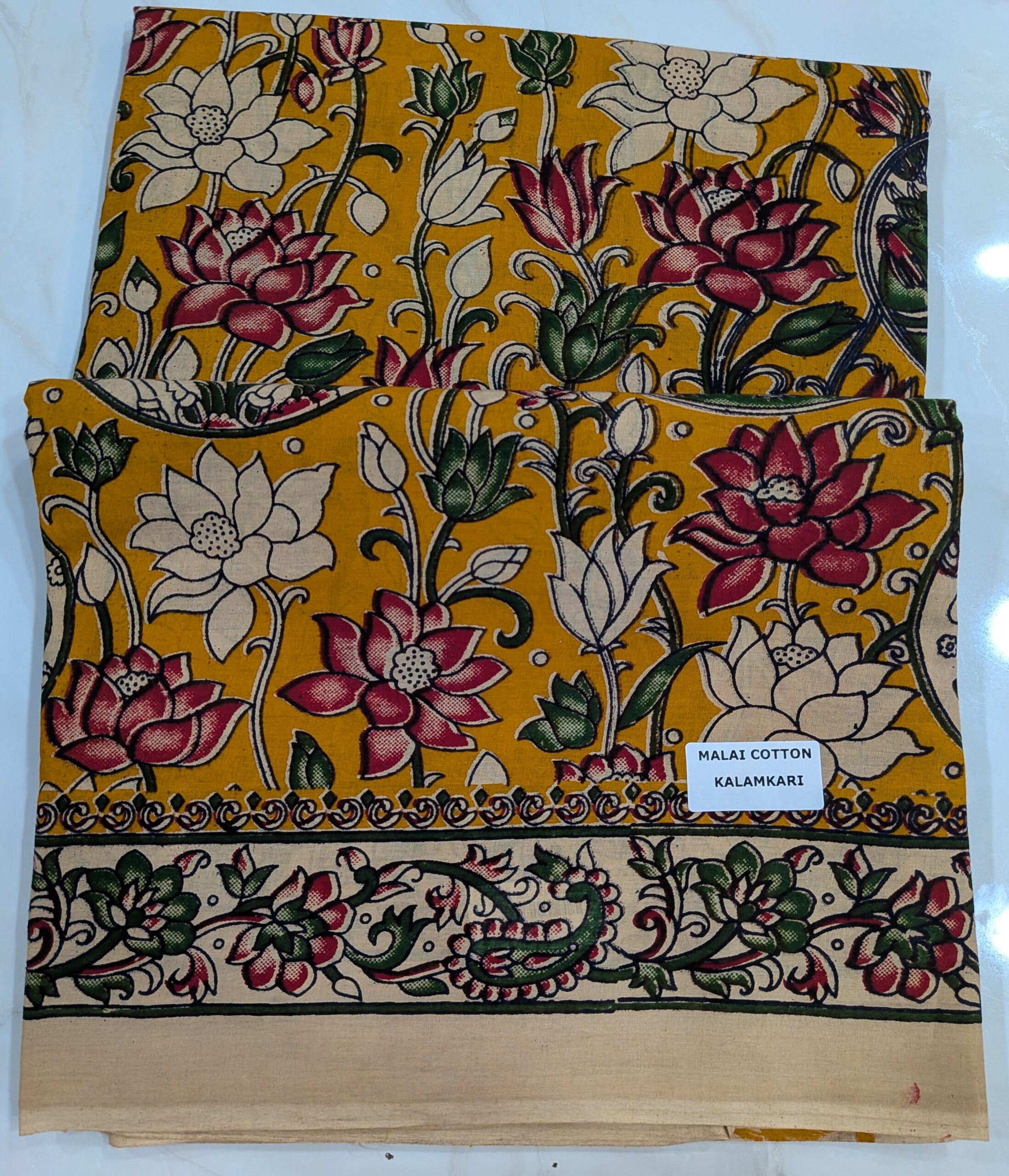 Malai Cotton Kalamkari Saree in mustard yellow with elegant lotus floral prints. Soft, lightweight, and breathable fabric ensures all-day comfort. Perfect for daily wear, office, and casual occasions.