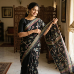 🖤 Elegant black cotton saree with a stylish leaf print and vibrant multicolor striped border. Soft, comfortable, and perfect for daily wear or casual occasions. Comes with a matching blouse piece and tassel pallu for a graceful look.